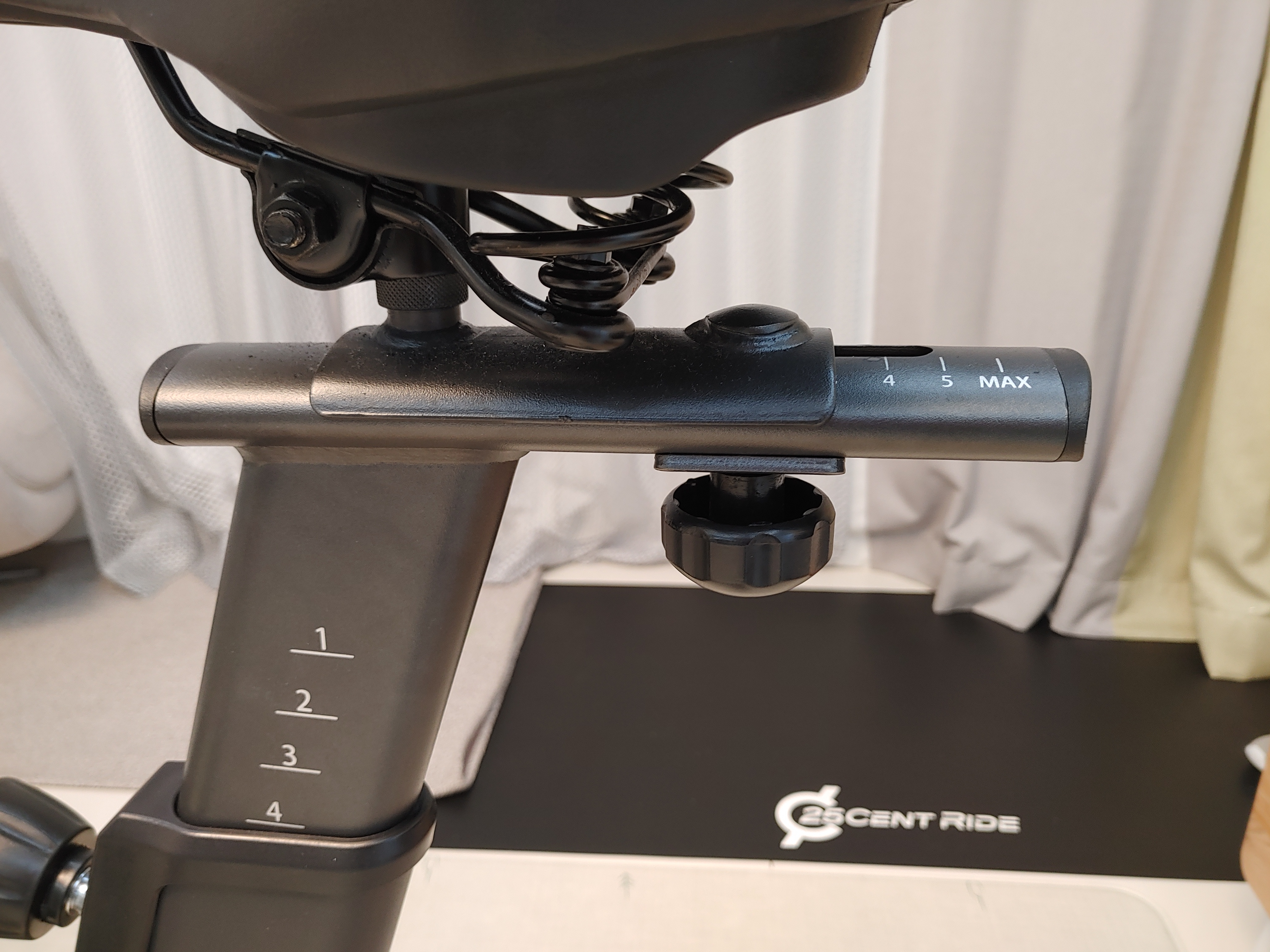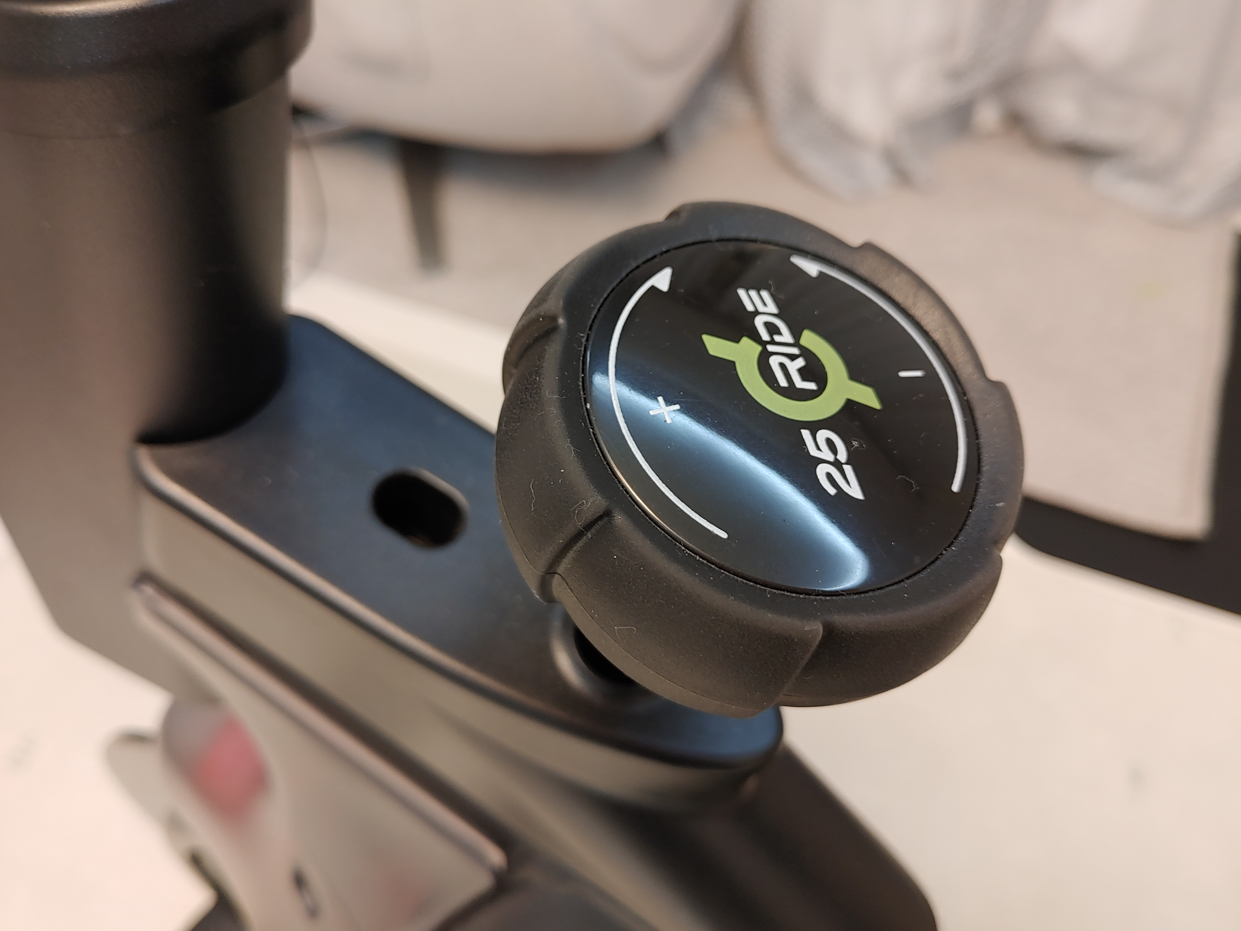 저항조절 레버입니다. 시계방향으로는 세게, 반시계방향으로는 약하게 조정이 가능하고 매우 부드럽게 돌아가는 디지털 방식으로 7레벨의 미세조절이 가능합니다. 마그네틱 방식으로 아무튼, 매우매우매우 조용합니다. 이 레버를 누르면 플라이휠의 브레이크를 잡아 제동이 가능합니다.