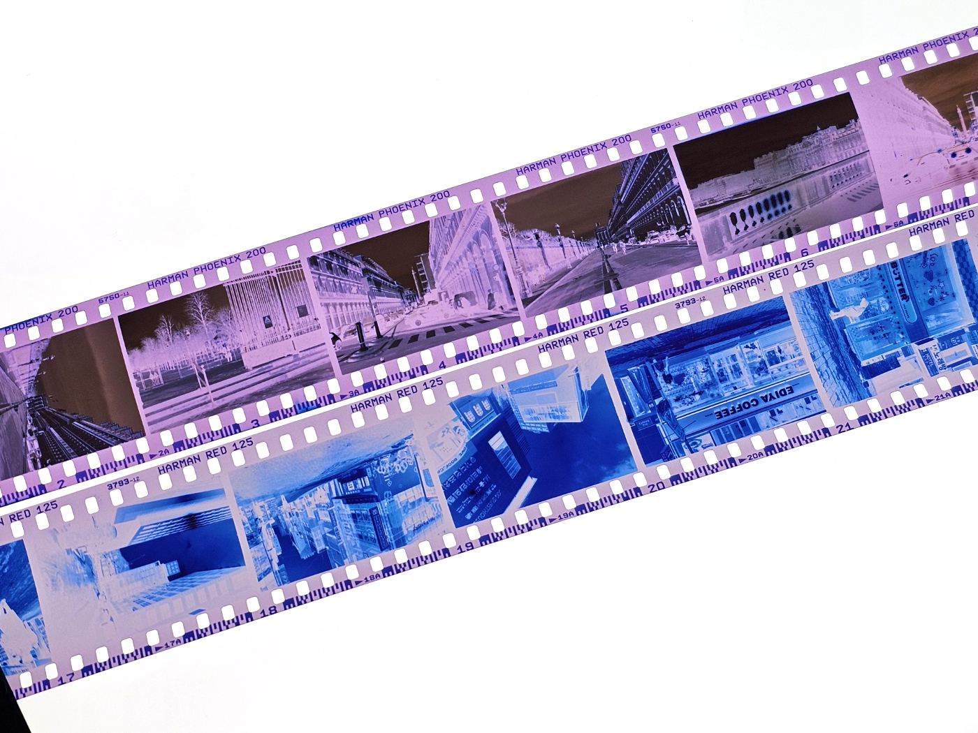 확실히 피닉스는 핑크 혹은 보라색에 가깝고, 레드는 훨씬 투명하고 마스킹이 연합니다. 레드에 촬영된 네거티브 이미지는 마치 파란 색으로까지 보입니다. 이러면 레드로 촬영된 사진을 스캔해보면 노란 색 계열로 나올 게 분명합니다만 필름 이름은 레드..네요.